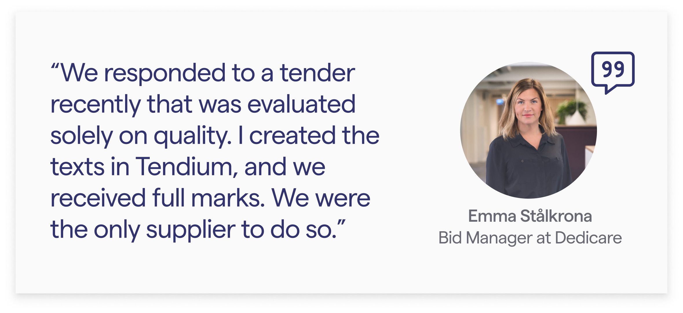 “We responded to a tender recently that was evaluated solely on quality. I created the texts in Tendium, and we received full marks. We were the only supplier to do so.” – Emma Stålkrona