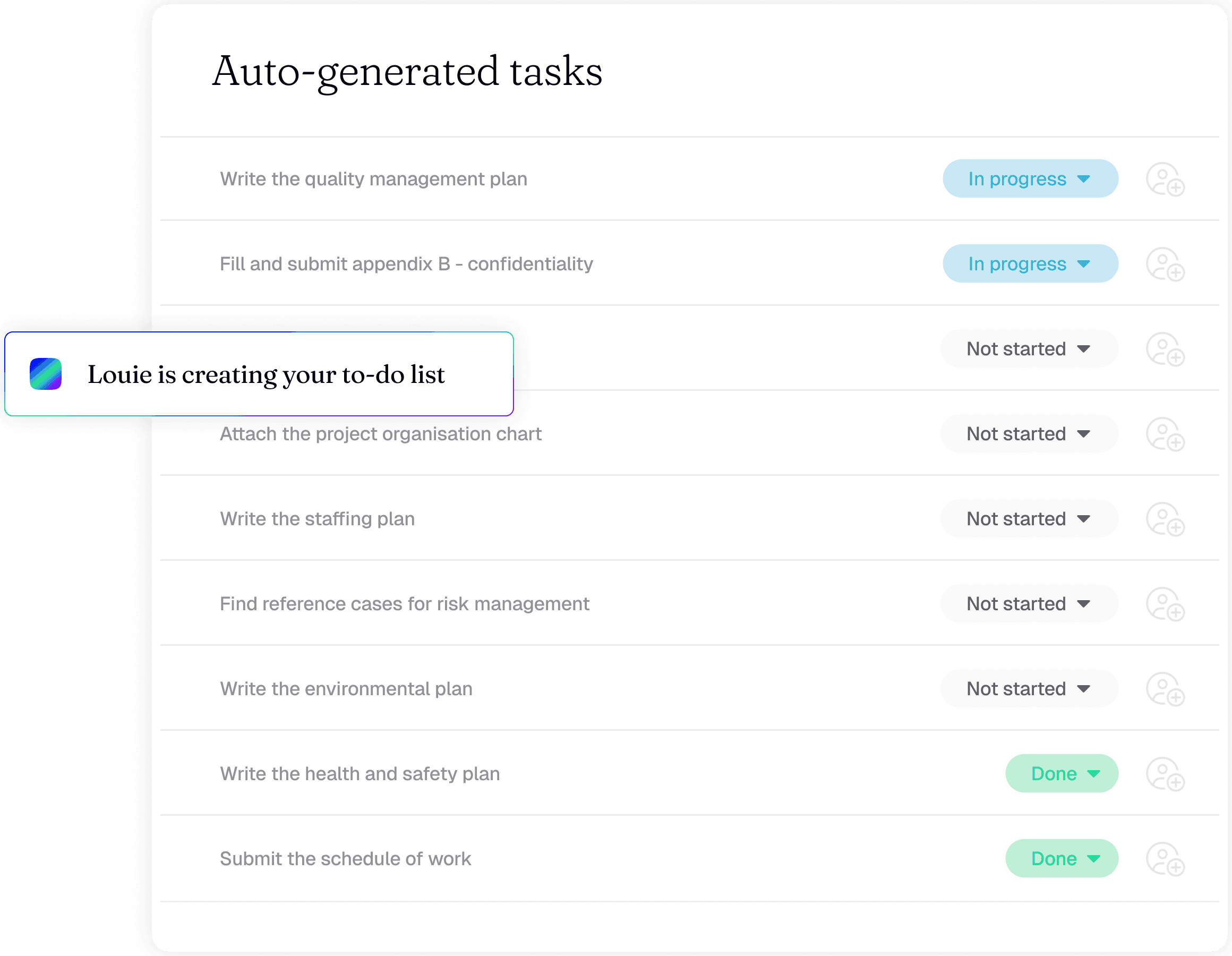 Let AI scan through the documents and create a high-level task list for you. Collaborate with colleagues, leave comments, set deadline and add your own tasks. No more copy pasting from documents into spreadsheets.