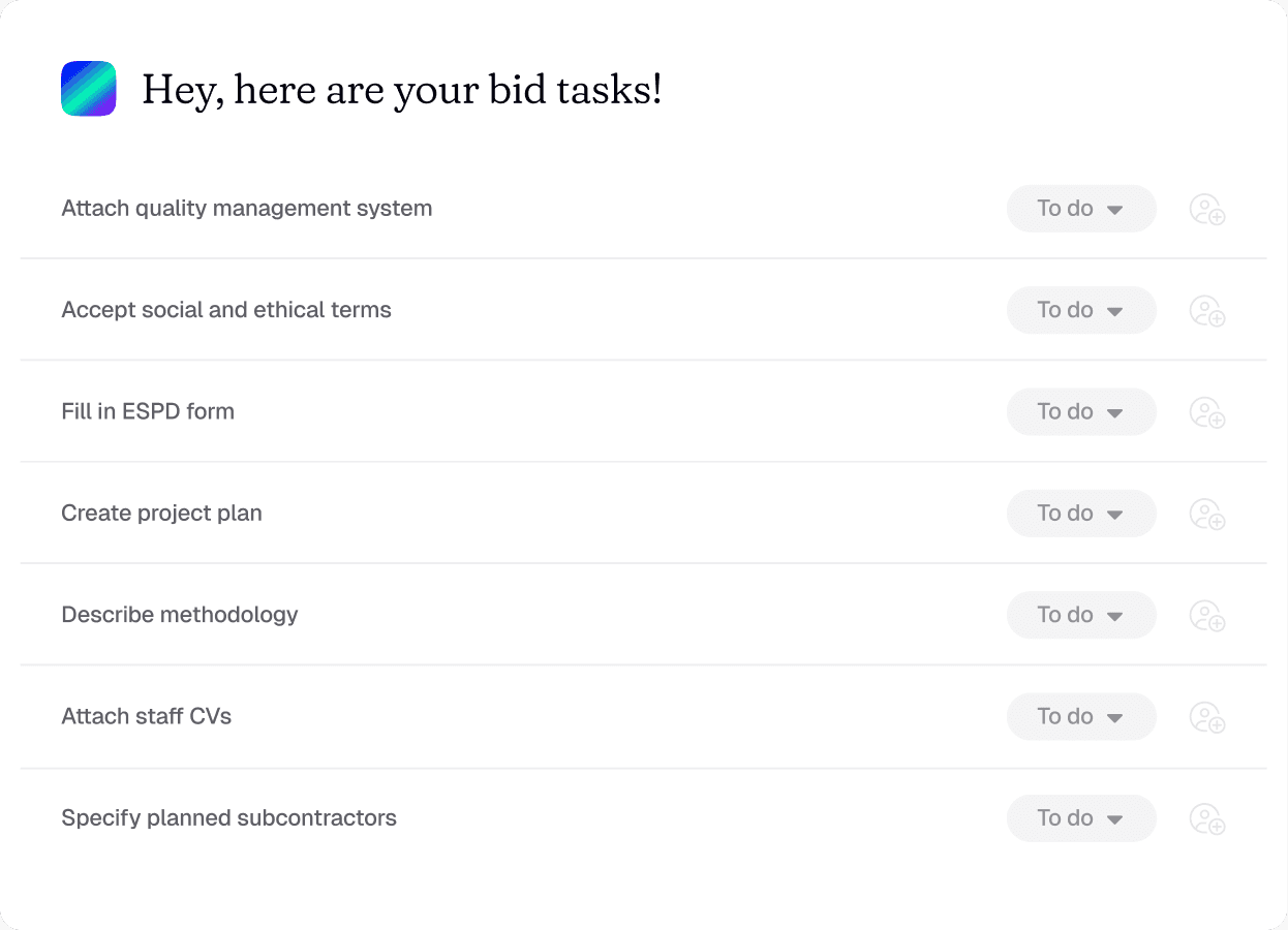 Your sidekick throughout the entire Tendium workflow - taking care of the heavy lifting so you can focus on winning deals.