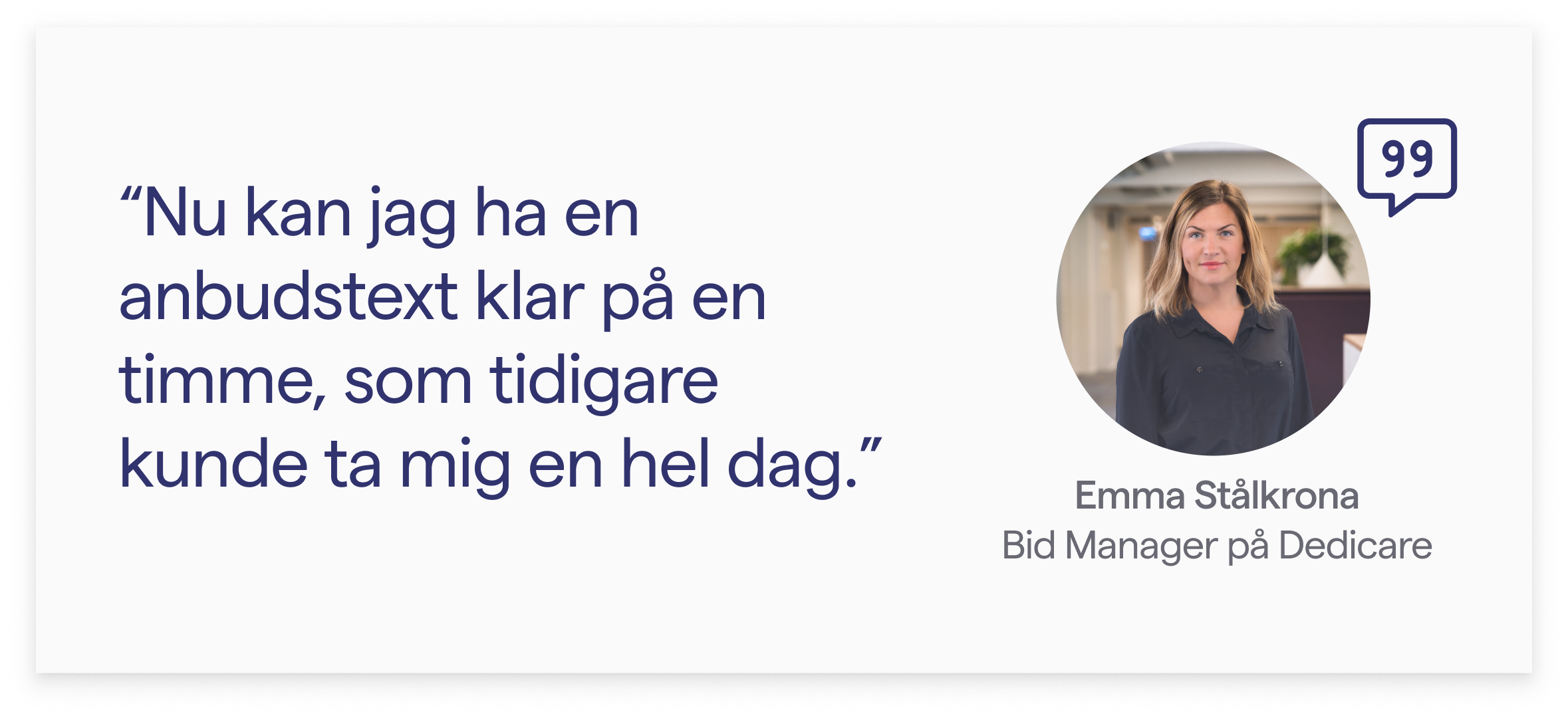 Emma beskriver att hon nu genererar anbudstexter med ett knapptryck. Tidigare klippte och klistrade hon från ett långt dokument av standardtexter och skrev sedan om. Nu får hon istället en färdig text att arbeta vidare med baserad på Dedicares egen information.