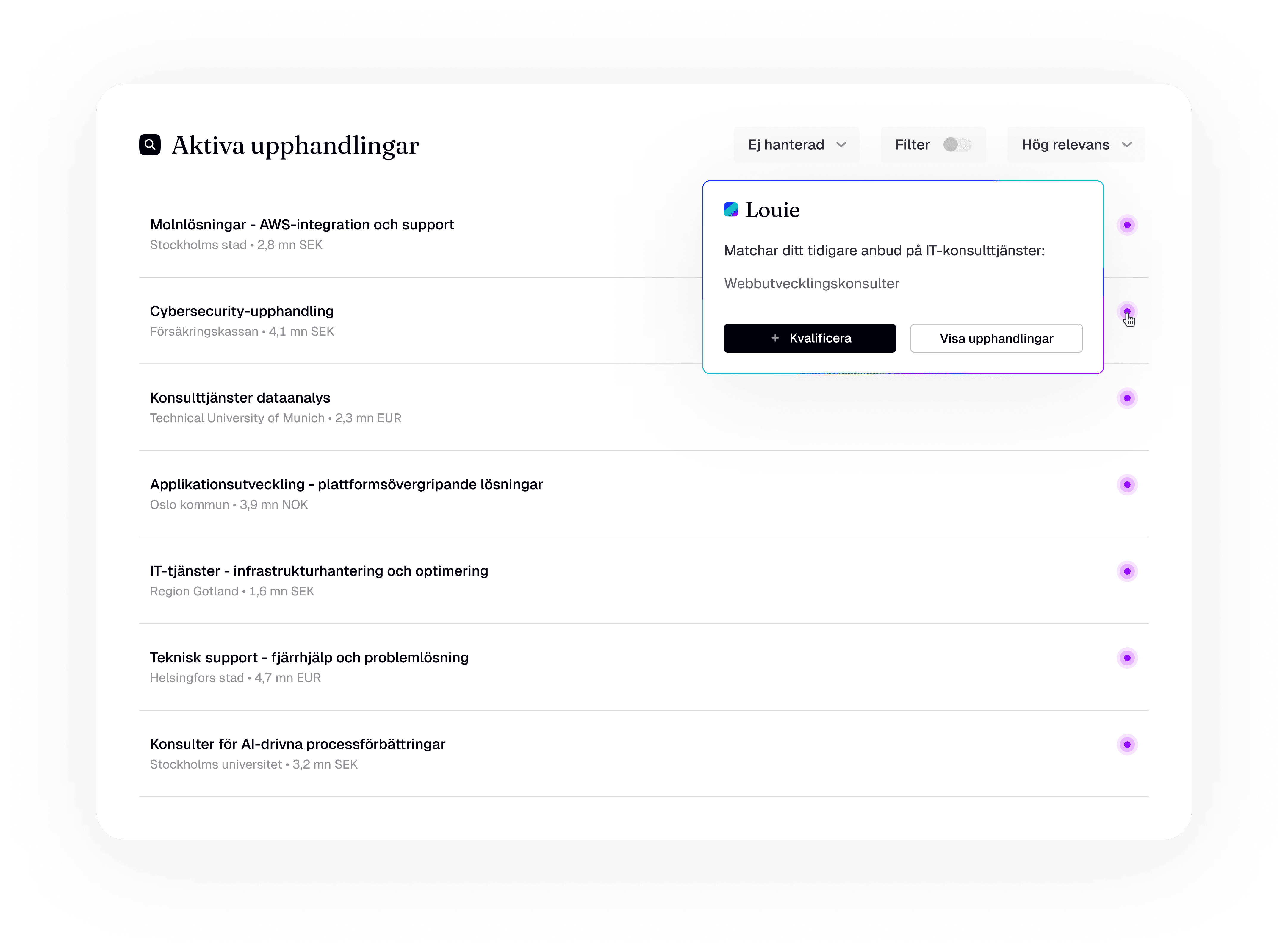 Få mejlnotiser om nya upphandlingar, sorterade efter relevans. Slipp leta nålar i höstacken.