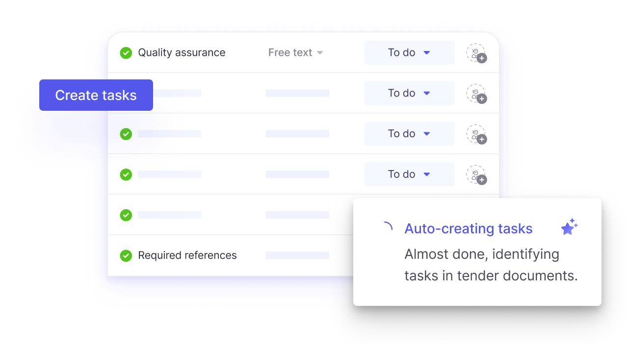 Time-consuming to get an overview of all requirements and everything that needs to be answered in your proposal? Not anymore. Let AI review the tender documents and generate automatic project plans for you.