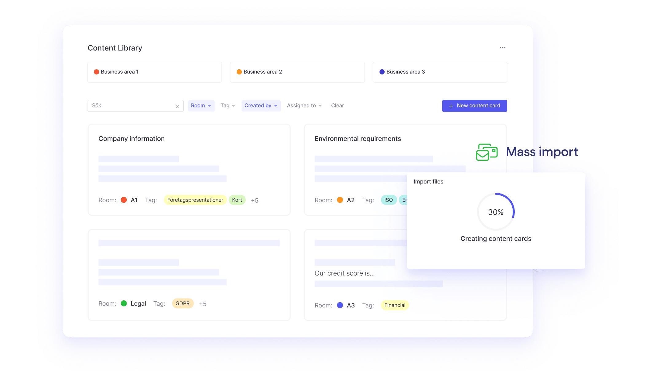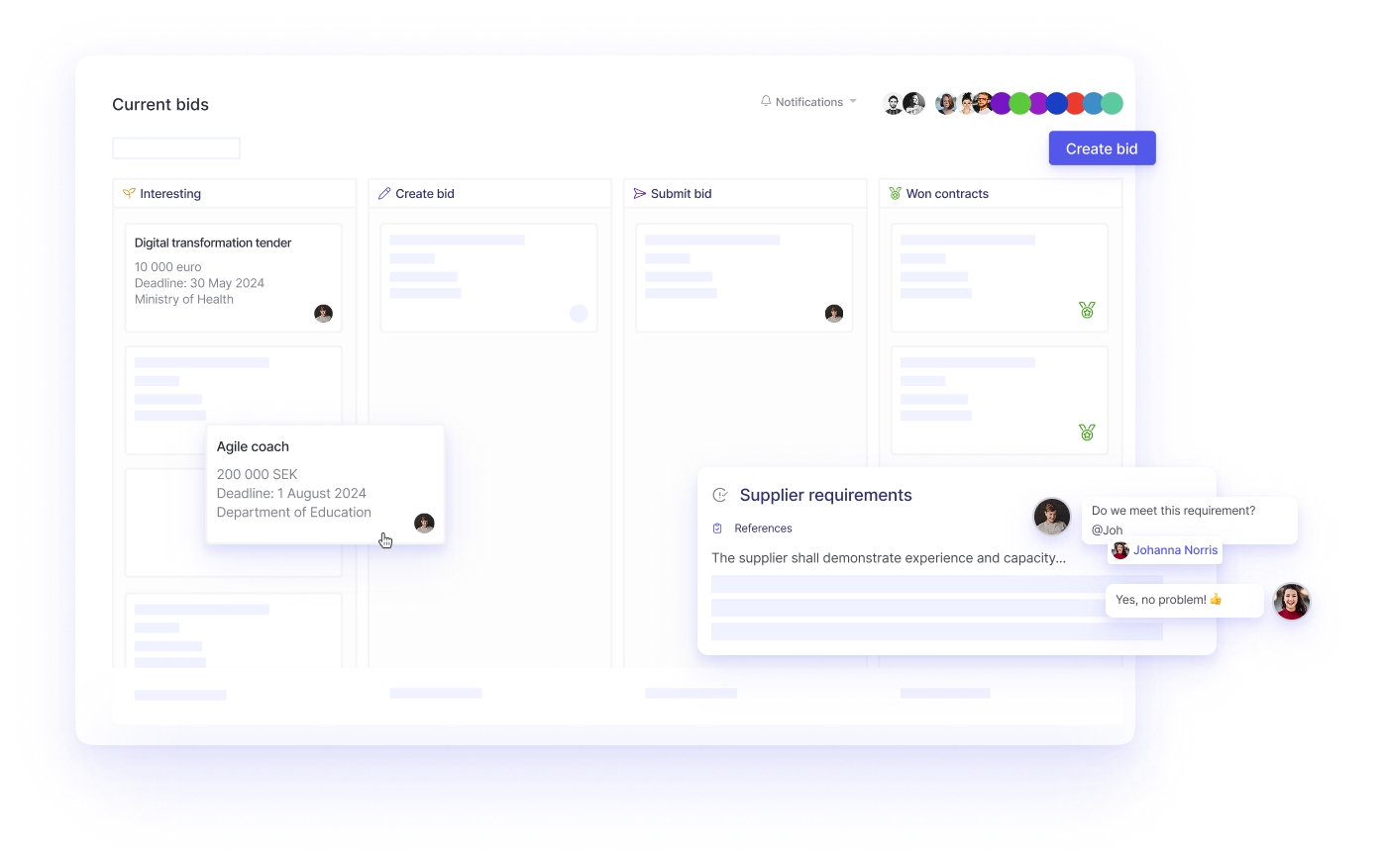 Easily get an overview of all deals, all tender requirements to be answered, and who is responsible for what. Centralise the process and collaborate better as a team.